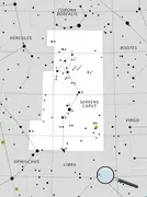 Sur les cartes anciennes, cet astérismeAstérisme : groupe d'étoiles dont la disposition vue depuis la Terre permet un rattachement à une figure ou un objet usuel. Glossaire était réuni avec celui d'OphiuchusOphiuchus Visible en été, bien qu'étant coupée par l'écliptique elle n'est pas considérée comme une constellation zodiacale. Ophiuchus et l'ensemble représentait un « porteur de serpent » ou le Serpentaire, soit Esculape le dieu de la médecine et de la chirurgie. Le contour de l'animal se superposant à celui du personnage, ils décidèrent que cette constellation serait divisée en deux par Ophiuchus, soit : Serpens Caput (la Tête du serpent) et Serpens Cauda (la Queue du serpent).